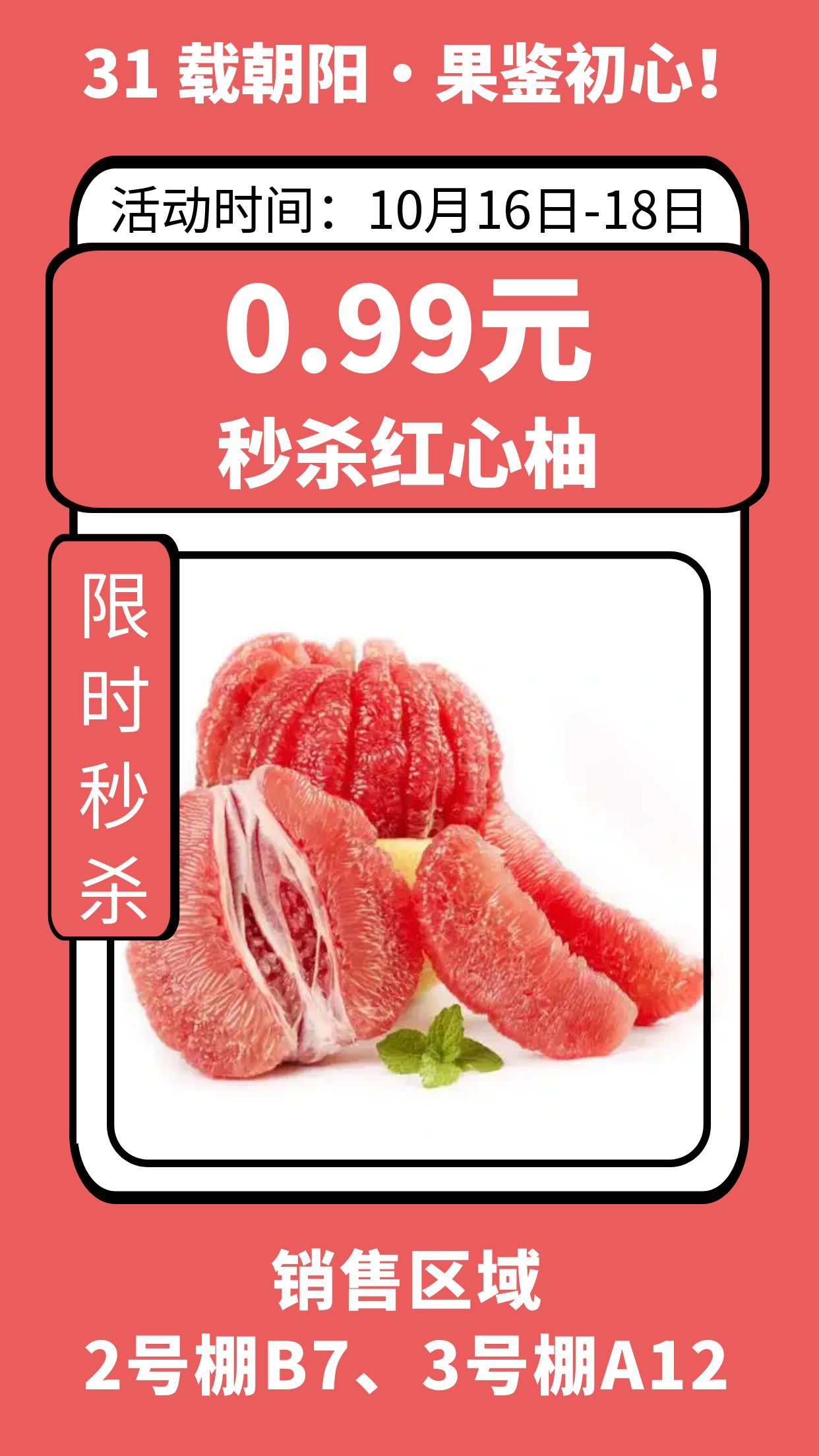 红柚、蜜橘超低价回馈 金秋正是吃柚子、蜜橘的好时节,朝阳 31 周年庆特别推出超低价回馈,每天限量供应,手慢无!精选皮薄肉厚、果肉晶莹、酸甜多汁的红心柚,周年庆专属价 0.99元/斤;果皮易剥、果肉无籽、口感清甜的蜜橘,周年庆专属价0.9元/斤,快来囤满全家吃个够!这两款鲜果均从产地直采,省去中间环节,既保证新鲜度,又把价格压到最低,是本次周年庆不可错过的 “必囤清单”!