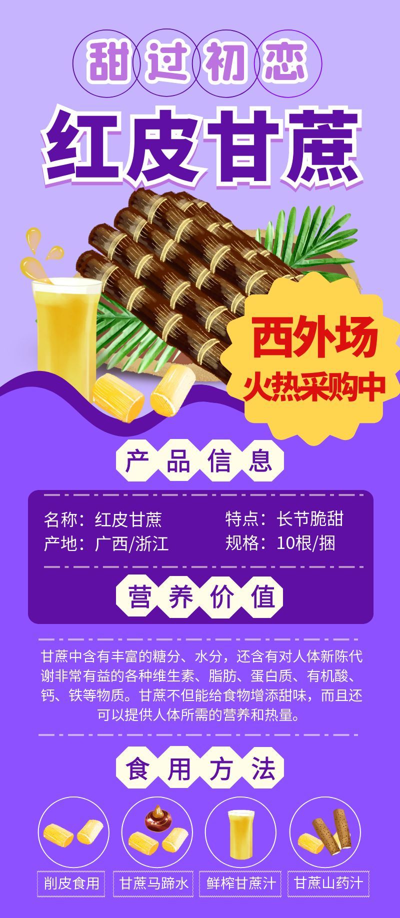 金秋限定!整根甘蔗甜满生活 甘蔗甜蜜上市,在水果市场,我们的甘蔗有着与其他批发市场截然不同的独特销售方式——整根销售,不去头不去根。看似简单的销售方式,却蕴含着满满的美好寓意。整根甘蔗,象征着 “甜蜜美满”,每一口清甜,都能让你感受到生活的幸福滋味;同时,它还寓意着 “节节高升”,就像甘蔗一节比一节高的形态,愿您在生活和工作中,都能步步高升,收获满满。 我们精选的甘蔗,来自广西、浙江等国内知名甘蔗种植产区,每一根都粗壮饱满、汁水充足、含糖量高。无论是自己在家榨汁解馋,还是作为礼物送给亲朋好友,都是金秋时节的绝佳选择。欢迎到西外场交易区选购,让这份甜蜜与美好,伴随您度过整个金秋。